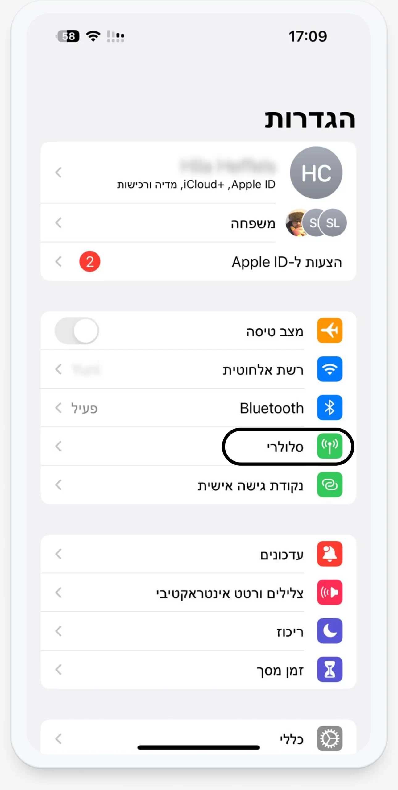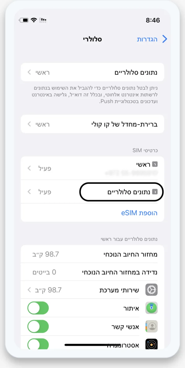 3. בעמוד "מנהל סים", "נתונים ניידים" צריך להיות מוגדר על האיסים שלכם.